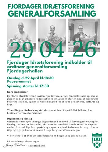 indkalder til ordinær generalforsamling i Fjordagerhallen - Pauserummet