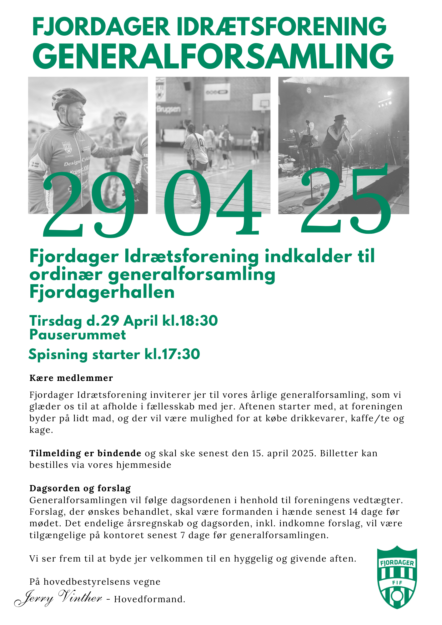 Forinden generalforsamlingen er Fjordager Idrætsforening vært ved lidt mad. Der kan købes kølige drikkevarer samt kaffe/te og kage.
